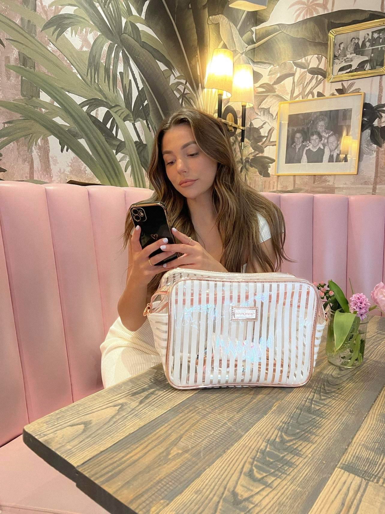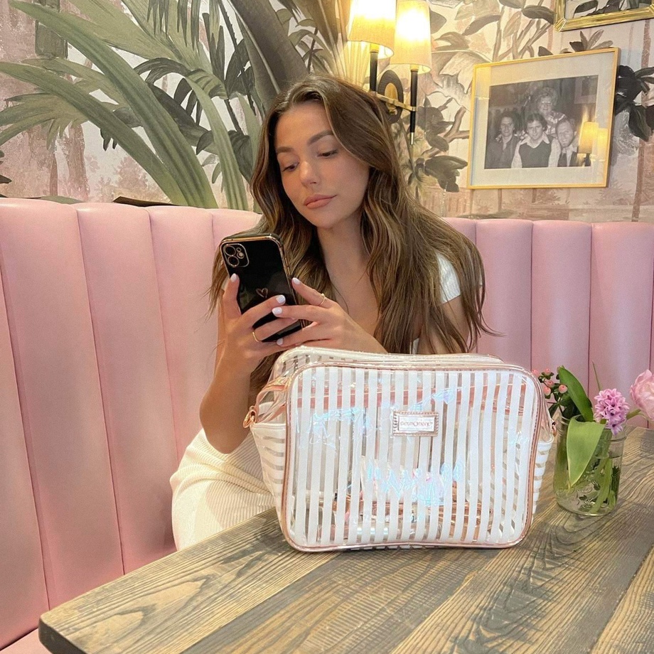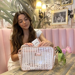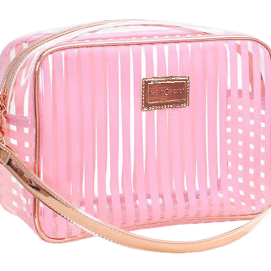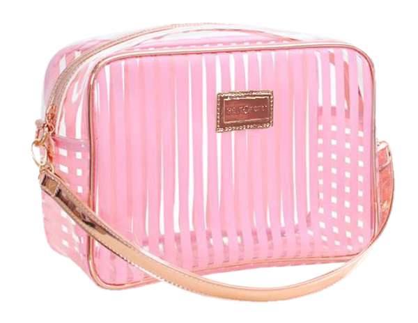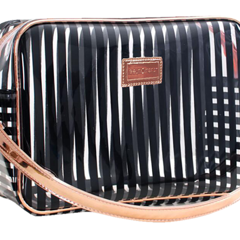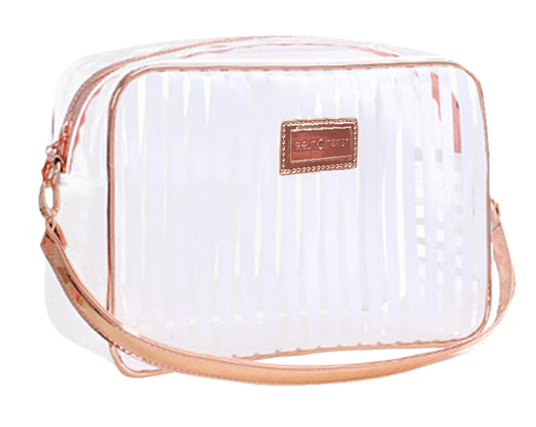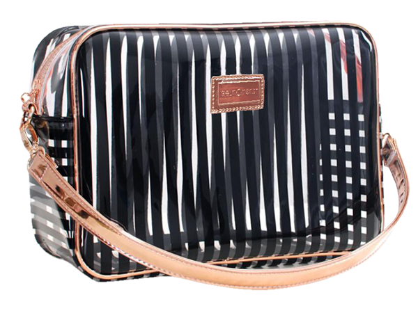 This Beauty Bag comes in three separate colours, all transparent with either pink, white, or black stripes with gorgeous rose gold detailing and a convenient strap. Why not take this opportunity to get one of each?
